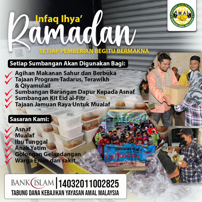 Dengan kedatangan bulan Ramadan, Yayasan Amal Wilayah telah merancang untuk memberi kebahagiaan melalui beberapa jenis bantuan kepada golongan yang memerlukan di Chow Kit, KL seperti :